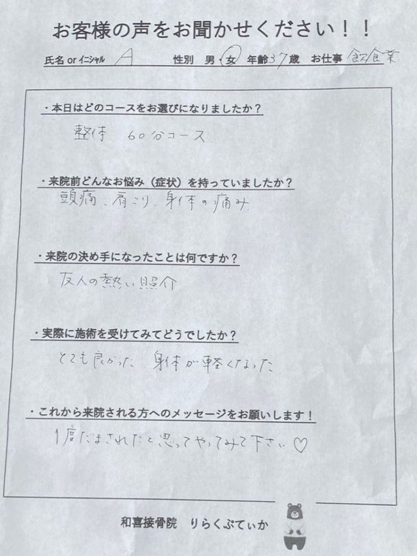 | 来院前のお悩み(症状) | 頭痛、肩こり、身体の痛み |