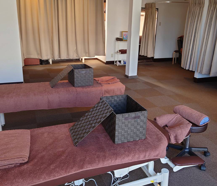広々としたスペースに、施術ベッドが3台配置されています。カーテンで仕切ることが可能なのでプライバシーも確保できます。