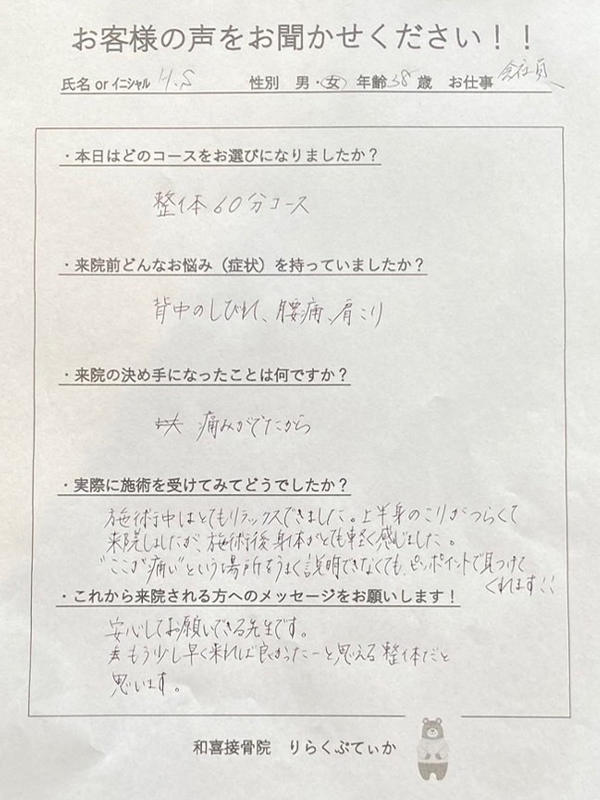 | 来院前のお悩み(症状) | 背中のしびれ、腰痛、肩こり |