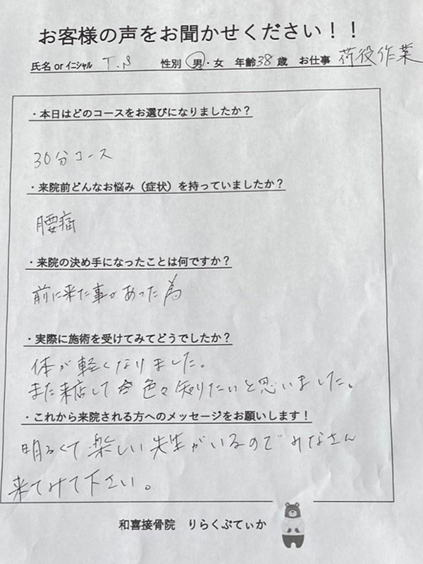 安心してお願いできる先生です。もう少し早く来れば良かったーと思える整体だと思います。