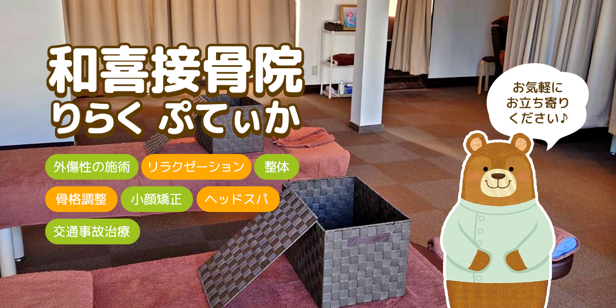 和喜接骨院では、痛みを根本から改善する施術法で、筋肉×骨格の歪みにアプローチし、お身体を本来あるべき姿に改善。お身体の歪みと緊張した筋肉への施術。骨格の歪みを整えるとともに、その歪みによってこわばってしまった筋肉をほぐし、本来の柔らかさ・しなやかさを持った筋肉へと導きます。骨格・筋肉にアプローチすることで、痛みを繰り返さない体作りを目指します。